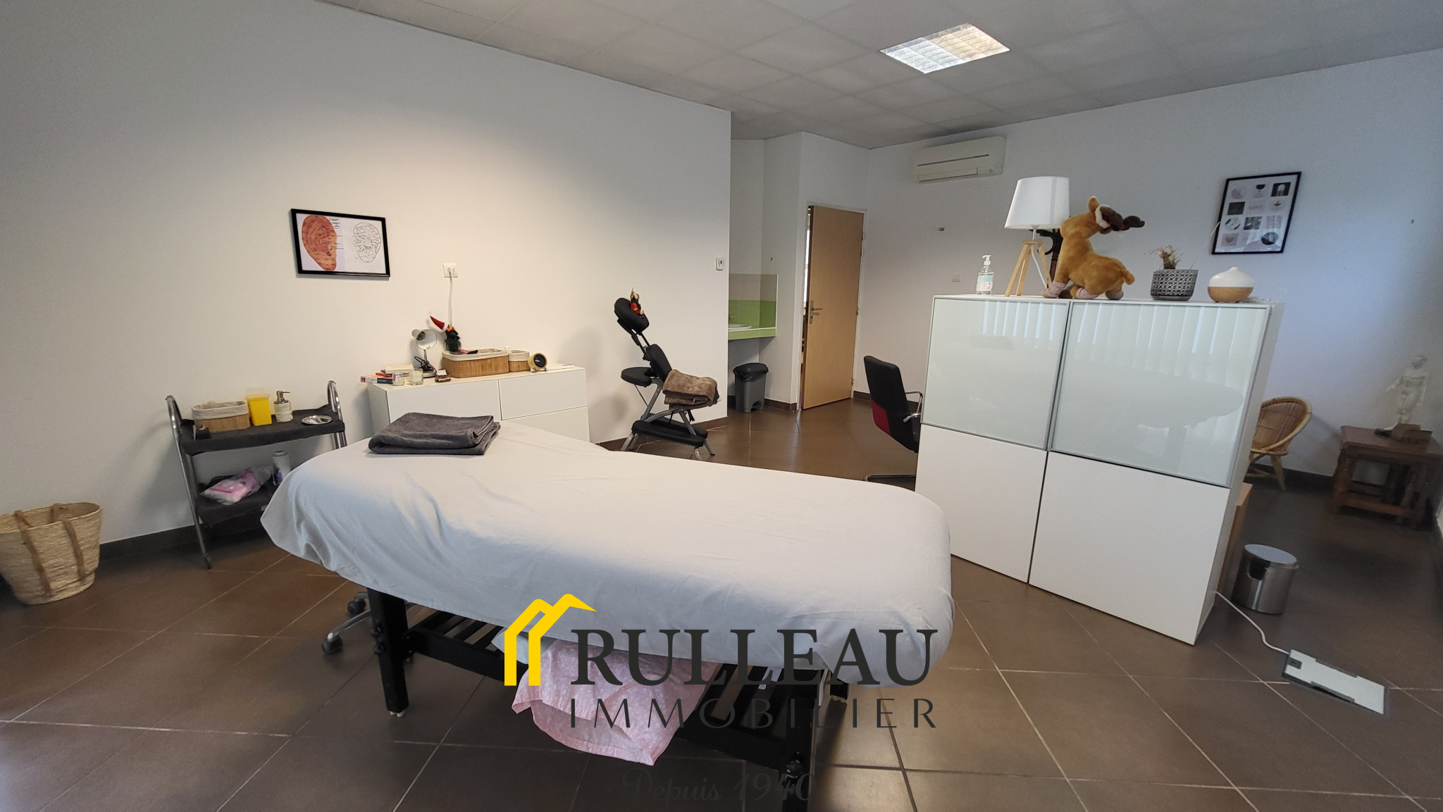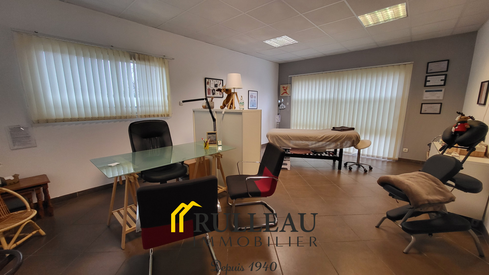 Il est composé d'un bureau de 28.46m², kitchenette partagée (2 professionels) 4.82m², salle d'attente partagée (2 professionnels) 24.30m². 2 places de parking clientèle, 1 place handicapé et 1 place privée.